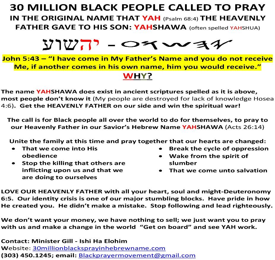 | Contact: Minister Gill - Ishi Ha Elohim The Black Prayer Movement Colorado Springs, Colorado 80910 CBPM's 2,881st Member Phone: 303.450.1245 Email Address: BlackPrayerMovement@gmail.com Web: www.cbpm.org/ blackprayermovement www.30millionblackspray inhebrewname.com |