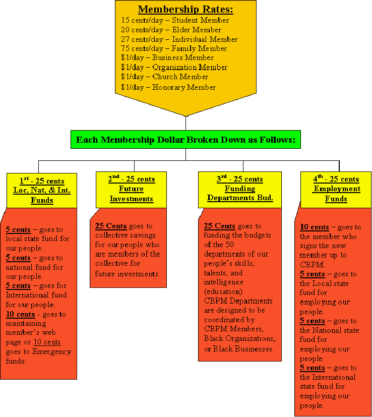 a. 10 cents – goes to the member who signs up the new member to the CBPM. In order for a member to receive 10 cents (10% of another member’s due), they would have to be a member of the membership department and they would have to have obtained a minimum of 10 new members to the CBPM before any disbursements of payments would be made to this individual. This individual would also be bound by the Employment Department regulations for the CBPM. See: www.cbpm.org/files/EmploymentDepartment and www.cbpm.org/membershipagent b. 5 cents – goes to the Local (State) Fund for employing our people. In all the works that the CBPM does, all positions (for instance department coordinators) are designed to get compensated for the works they do for the organization. Therefore the Local (State) Fund is designed to compensate individuals doing works for the CBPM locally (state wide). There must be criteria’s that we, the CBPM members, determine in order for compensating individuals working for the CBPM. The compensation of individuals will be based on their input and role in the CBPM organization. Naturally, there will be no compensation for any individual working for the CBPM until the budget gets large enough to employ our people. The department coordinators will most likely be the first individuals to get compensated in the CBPM because of the important role that they will be playing for the Collective Black People Movement (CBPM). c. 5 cents – goes to the National (Country) fund for employing our people. Therefore the National (Country) Fund is designed to compensate individuals doing works for the CBPM on the National level (Nation wide). d. 5 cents – goes to the International (Worldwide) fund for employing our people. Therefore the International Fund is designed to compensate individuals doing works for the CBPM on the International level (World wide). |