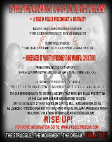 | FOR IMMEDIATE RELEASE: REV. DR. MARTIN LUTHER KING JR.'S BIRTHDAY, A FEDERAL HOLIDAY, VIOLATED! Date: Friday June 18, 2010 ____________________________________________________ “Project: Rise Up” ~Presents~ An Awareness Month “CITIZENS AGAINST OFFICIALS VIOLATING THE LAW” The newly formed group, “Project: Rise Up” will host an AWARENESS MONTH: “CITIZENS AGAINST OFFICIALS VIOLATING THE LAW” A peaceful demonstration is set for June 22, 2010 in Robert W. Woodruff Park, Auburn Ave NE, and Peachtree St. NE, Atlanta, GA from 9:00 AM - 6:00 PM. A candlelight vigil will commence at 7pm following the demonstration. This event will bring attention to violations of Martin Luther King Jr.’s birthday, a Federal Holiday. In addition to the violations of MLK’s Federal Holiday, the group’s objective is to bring awareness to the violations and outrageous acts of those who have sworn to uphold, honor and enforce the law of our Constitution, Treaties, and the rights of we the people of the United States of America. Officials take oaths to administer the law in a fair and unbiased manner, but in the case of many, attempt to administer their own biased opinions and prejudices in breach of their oaths of office and in violation of the Law. The campaign will highlight the violation of Martin Luther King Jr.’s birthday by officials who chose to contravene the Federal Holiday law which is a direct violation of Title 5 USC § 6103, and Public Law, Section 2 98-144, by holding trial court on Martin Luther King’s Birthday, as well as a myriad of other Constitutional violations. “We will not stand by and allow them to disrespect Martin Luther King Jr.’s legacy,” says one of the group’s spokespeople. “They held court open to prosecute an innocent man. If we let them get away with desecrating King’s birthday, we’ll allow them to destroy the movement, the dream, and the legacy of a great man. This act will set precedence for them to violate all other public holidays, as well as many other constitutional rights. Next, they’ll be violating, Washington’s Birthday, Lincoln’s Birthday, Veterans Day and even Independence Day! This issue affects us all! It is another example of corrupt public officials violating the law, as opposed to protecting and respecting our Human, Constitutional, and Political Rights.” The voice of liberation, impartiality and human rights for all people must resonate throughout the halls of justice, as it once did in the early sixties. Let us emulate the great accomplishment of change, to commemorate Martin Luther King Jr. and the 250,000 concerned citizens who marched on Washington for civil and ultimately human rights. Project: Rise Up is calling on support from people of all walks-of- life, members of all communities, political, non-profit and grass roots organizations, corporations, local, national, and international media, all radio stations, and all other concerned people to take action on this most important matter. We must preserve the legacy of this great man and remind America that our Government is of the people, by the people, and for the people. “Citizens Against Officials Violating the Law” Awareness Month was formed in 2010 by a group of concerned citizens who recognized the importance of bringing awareness and attention to violations of this great day, as well as the violations of our Human, Constitutional, and Political Rights by those who are supposed to protect our rights. We aim to take action to defend the rights of the people. Our goal is to ensure every public official that is responsible for upholding our Constitution, Treaties, and the Laws of our country, does just that! The group will also host a Worldwide Demonstration on Capitol Hill in Washington DC on August 27, 2010, just one day prior to the forty-seventh anniversary of Martin Luther King Jr.’s historic “March on Washington”, which took place on August 28, 1963. “Officials Are Not above the Law!” Contact: Frank Gillette Email: publicity@projectriseup.com Phone: 770. 885 3743/ 770.334.0253 www. projectriseup.com |